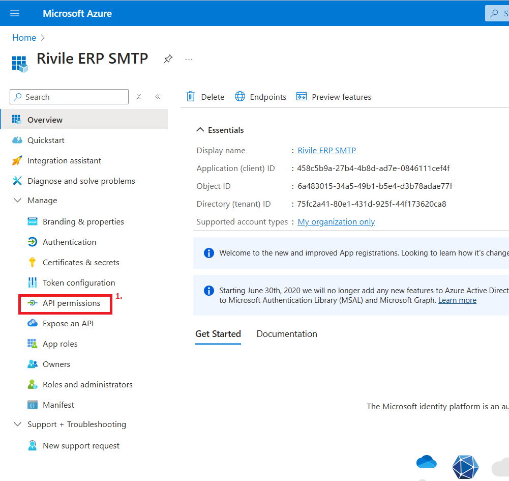 Atsidariusiame lange nusikopijuokite laukų Application (client) ID ir Directory (tenant) ID reikšmes. Jų reikės tolesniam Rivile ERP konfigūravimui.
