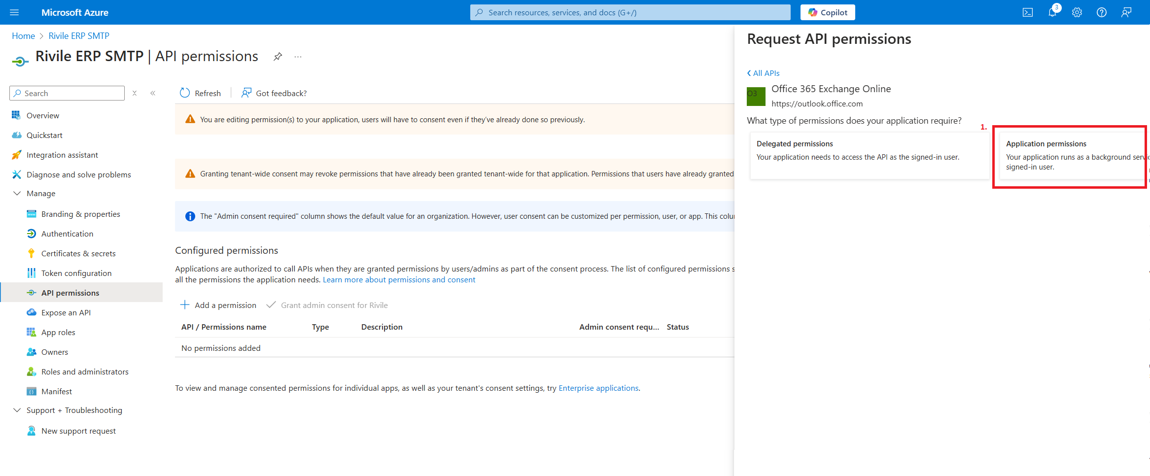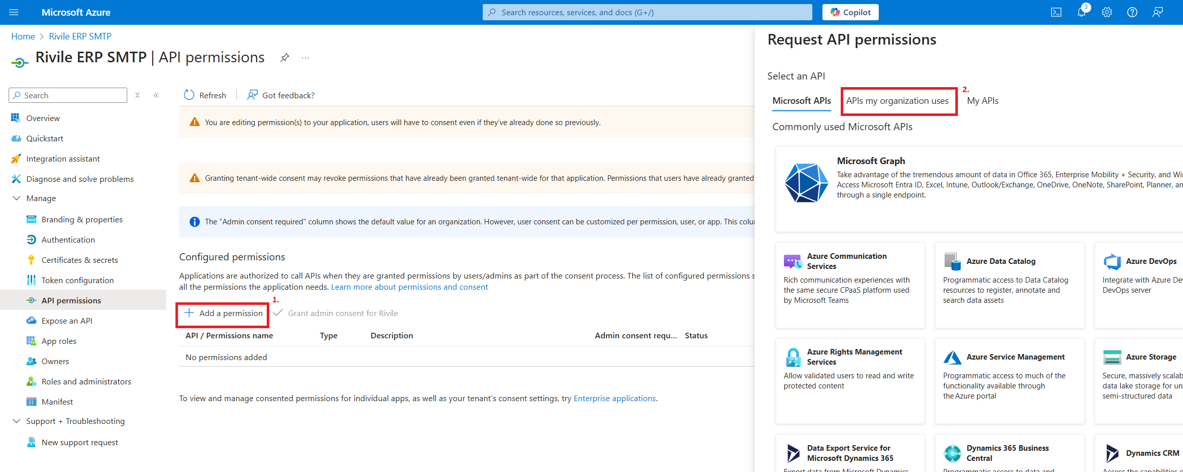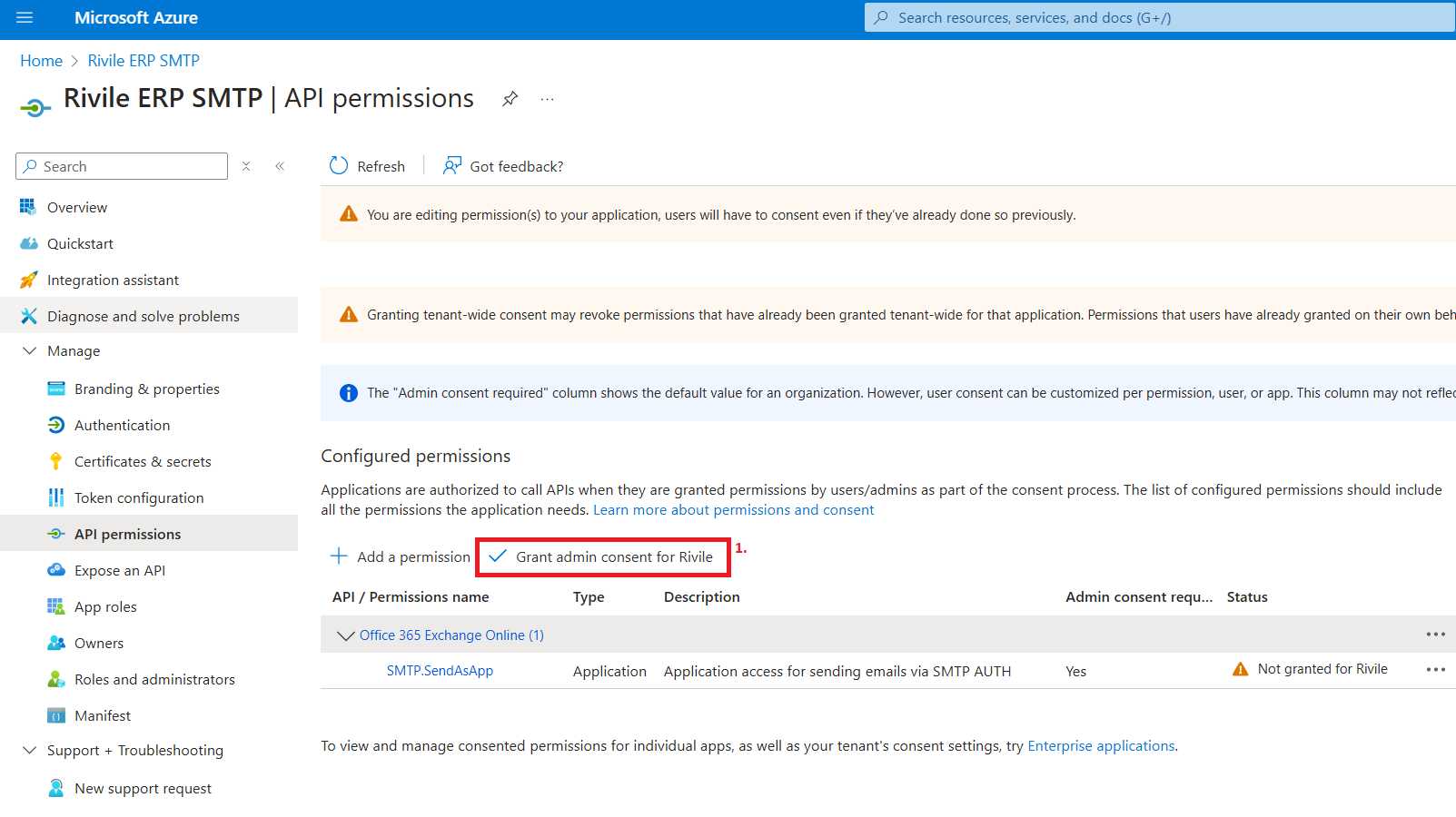 Atlikus aukščiau nurodytus veiksmus, su sugeneruotu slaptu raktu, Rivile ERP turės teises siųsti laiškus visų jūsų Microsoft 365 organizacijoje esančių pašto dėžučių vardu. Rekomenduojame sukurtai aplikacijai apriboti leidimus siųsti tik konkrečių pašto dėžučių vardu. Daugiau informacijos apie tai galite rasti Microsoft 365 dokumentacijoje.
