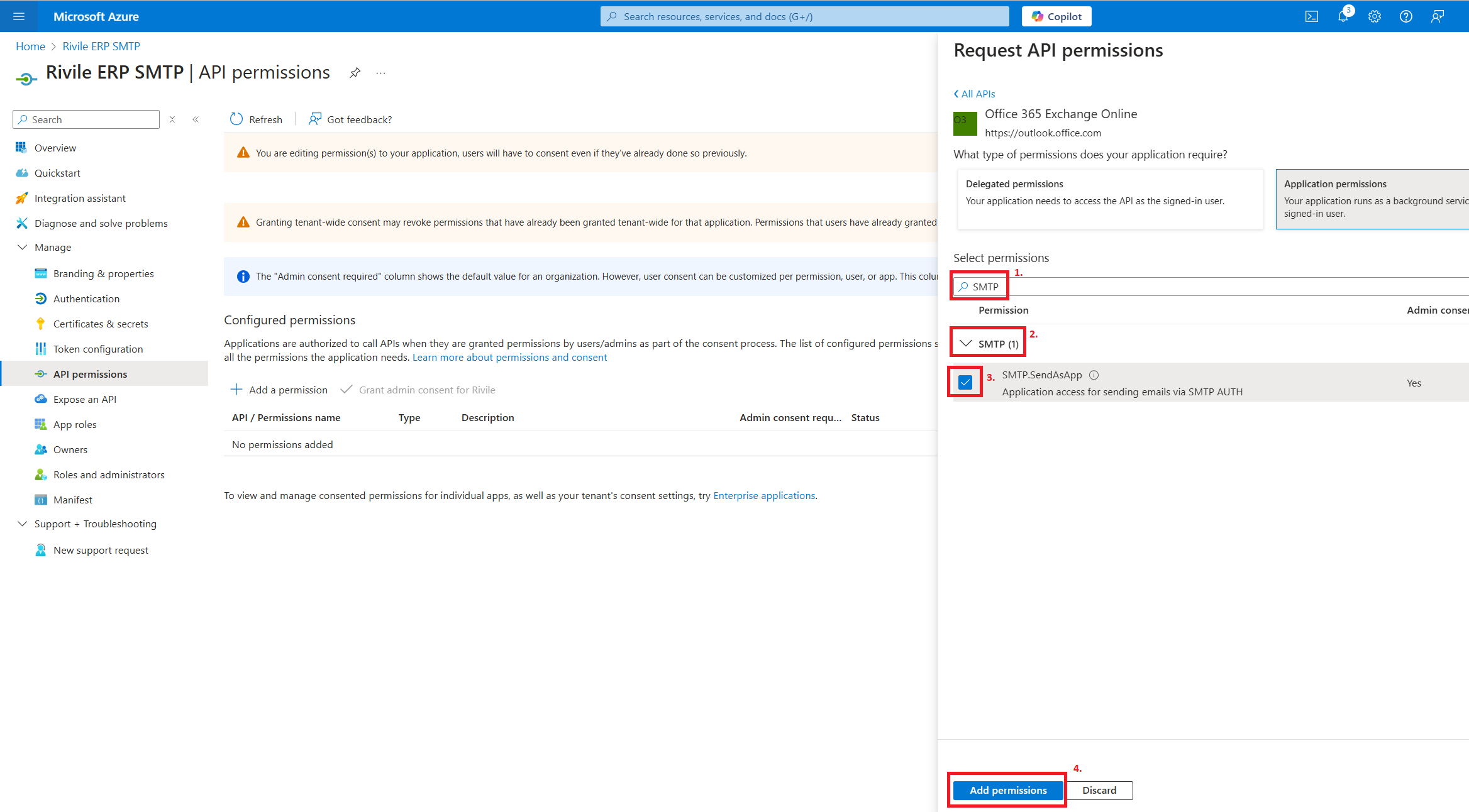 Leidimų paieškoje įveskite STMP, išskleiskite STMP leidimų medį, uždėkite varnelę ant STMP.SendAsApp ir paspauskite mygtuką Add permissions.